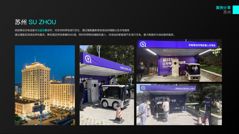 找樁移動充電設備與白金漢爵合作,對蘇州的用電進行優化,通過儲能重新規劃場站的儲能以及充電服務 通過儲能實現場站用電最優,降低酒店用電高峰的MD值,同時利用移動儲能機器人,對場站的新能源汽車進行充電,最大限度的為場站提供服務